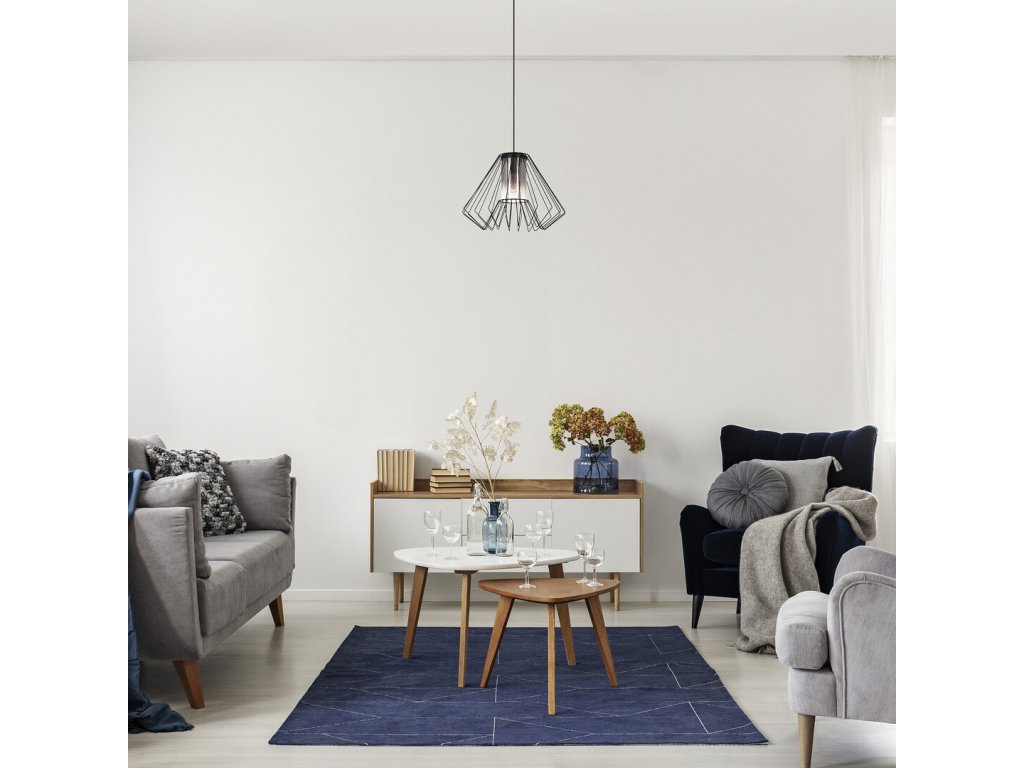 Svítidlo je zavěšeno na černém kabelu a upevněno ke stropu pomocí malé kulaté základny, která nenarušuje jeho minimalistický vzhled. Díky otevřené konstrukci zůstává žárovka dobře viditelná, což umožňuje využití designových žárovek s dekorativním vláknem nebo netradičním tvarem a zvýraznění celkového charakteru svítidla.