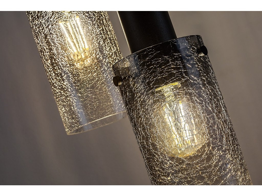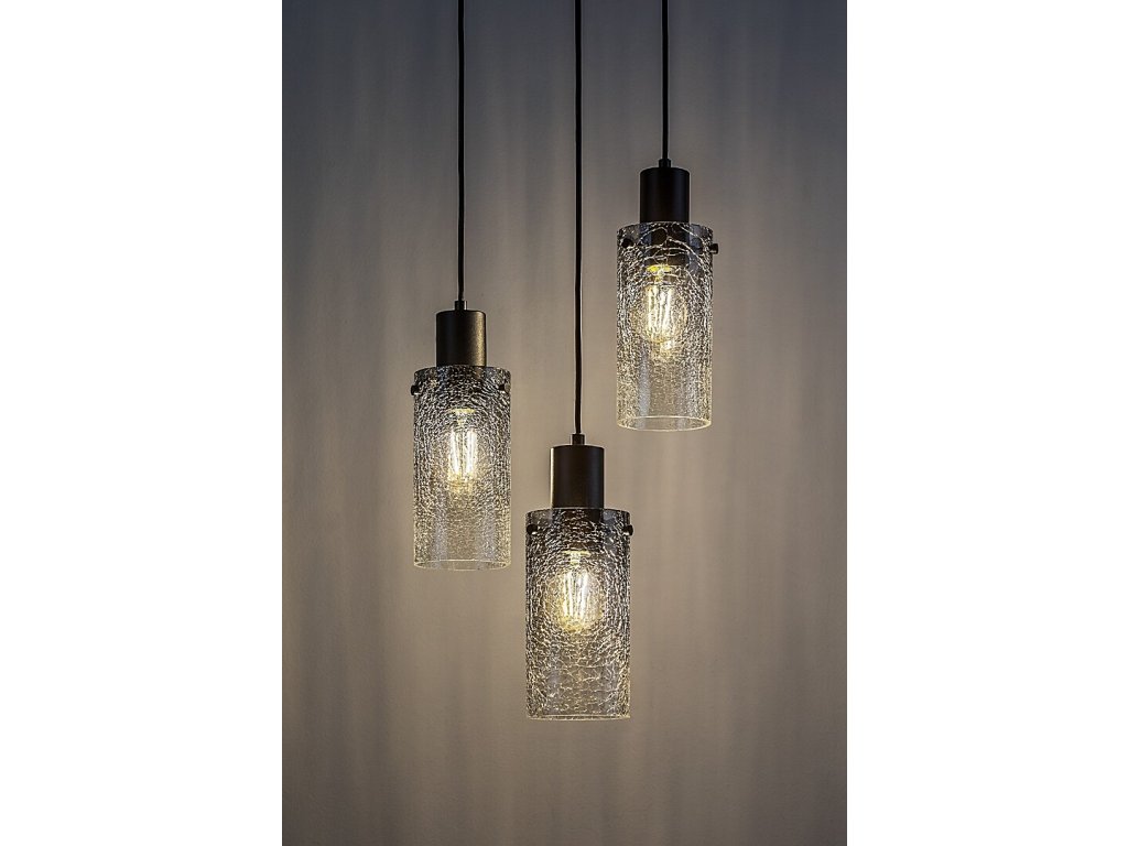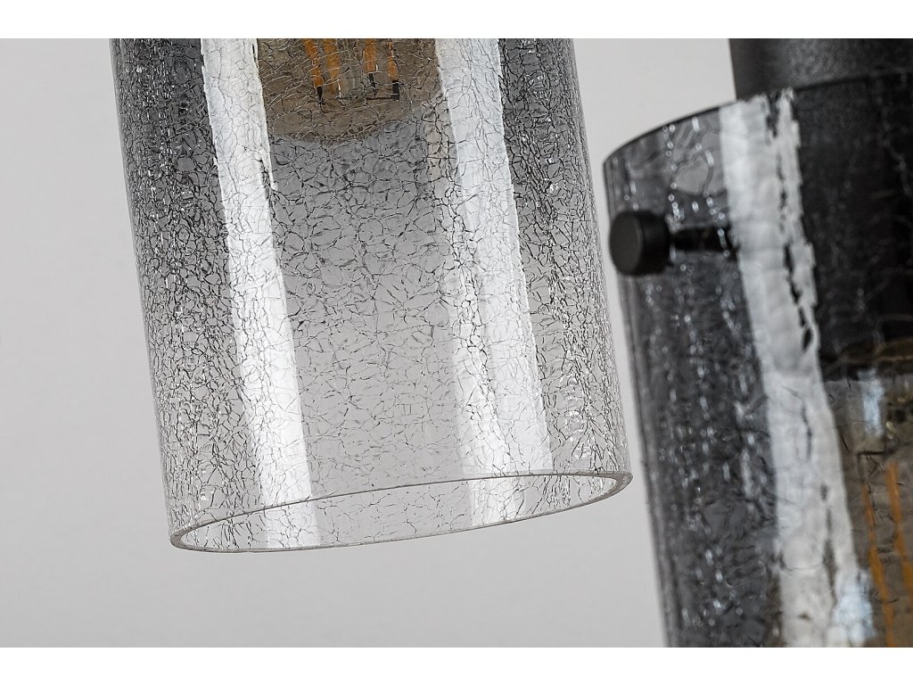 Konstrukce svítidla je tvořena velkou kulatou stropní základnou v černém provedení, ze které jsou zavěšeny tři samostatné světelné body v různých výškách. Každý z nich je osazen válcovým stínidlem z kouřového skla s jemně strukturovaným povrchem, který světlo lehce rozptyluje a dodává mu měkký, dekorativní charakter. Průhledná stínidla zároveň umožňují plně vyniknout samotným žárovkám, což z tohoto modelu činí ideální volbu pro použití designových filamentových nebo jinak tvarově výrazných žárovek.