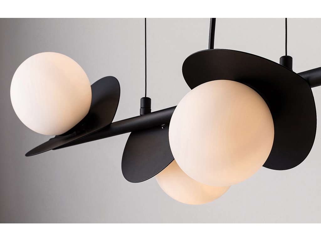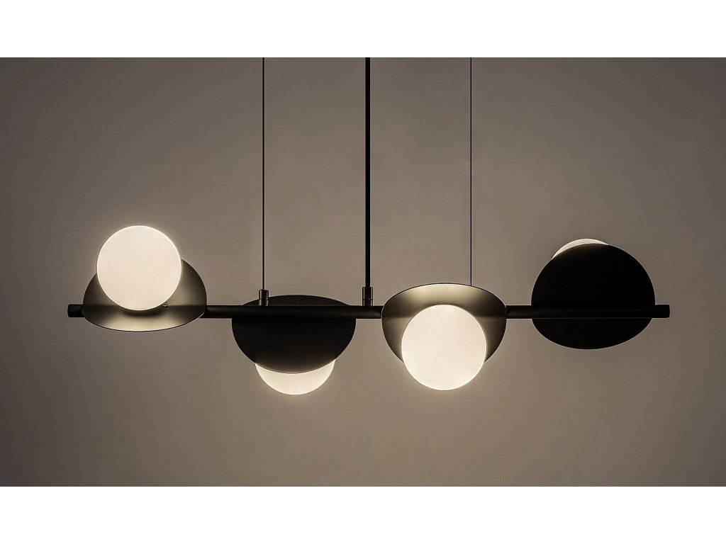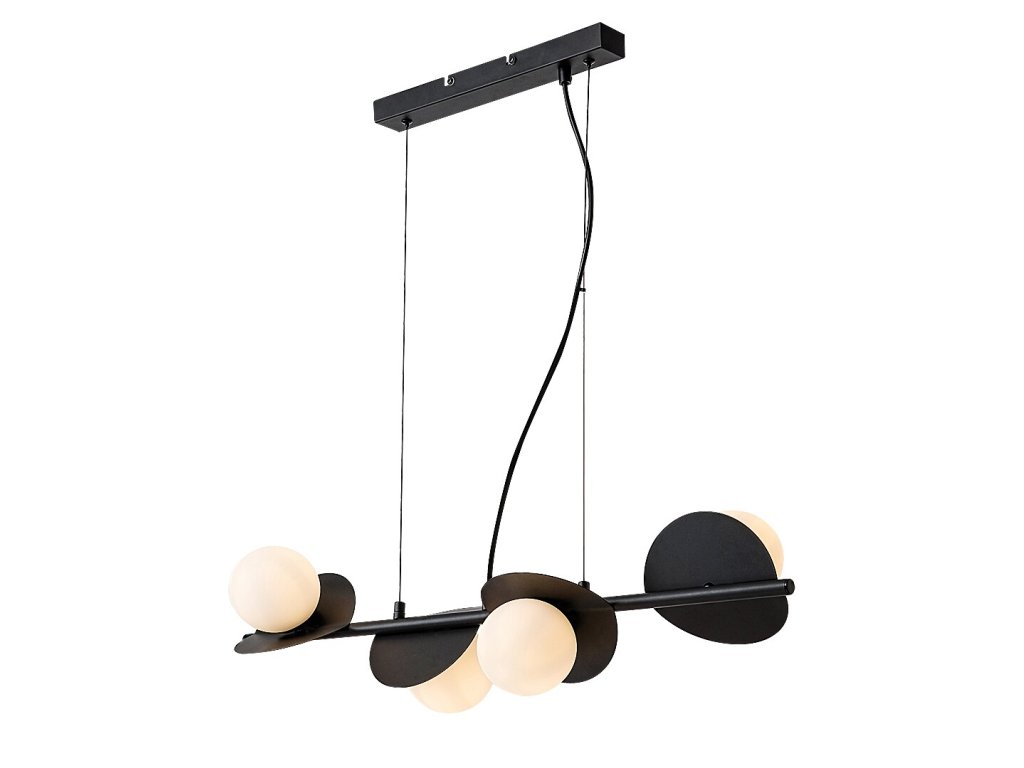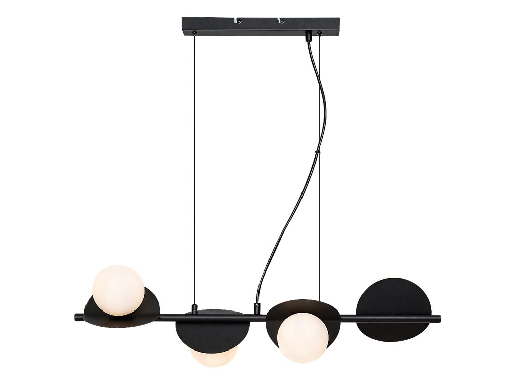 Závěsný lustr Jules přináší výrazný a současně vyvážený design, který kombinuje industriální styl s nadčasovou černo-bílou barevností. Kovová konstrukce v černém provedení je doplněna čtyřmi kulovitými skleněnými stínidly v bílé barvě, která jsou zasazena do plochých, jemně zakřivených kruhových prvků. Jednotlivé světelné body jsou rozmístěny v jedné linii na nosné liště a každý z nich směřuje jiným směrem, díky čemuž světlo není soustředěno pouze do jednoho místa, ale rovnoměrně se rozprostírá po prostoru. Lustr tak funguje nejen jako hlavní zdroj osvětlení, ale i jako výrazný designový prvek interiéru. Skvěle se hodí nad jídelní stůl, do obývacího pokoje, ložnice nebo moderní kuchyně.