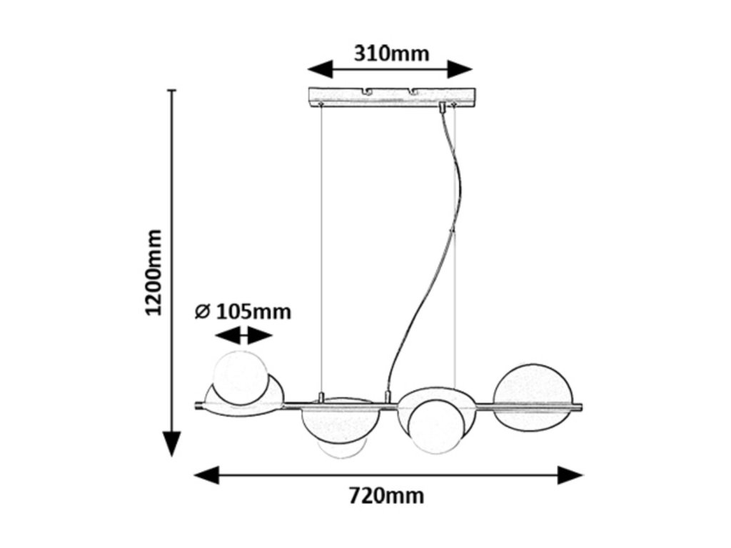 Celková délka světelné lišty činí 720 mm a maximální výška zavěšení je přibližně 1200 mm. Průměr jednotlivých skleněných stínidel je 105 mm. Podlouhlá stropní základna má délku 310 mm a zajišťuje čisté a stabilní uchycení ke stropu. Závěsný lustr Jules je ideální volbou pro ty, kteří hledají originální svítidlo s výrazným vzhledem a funkčně rozloženým světlem v interiéru.