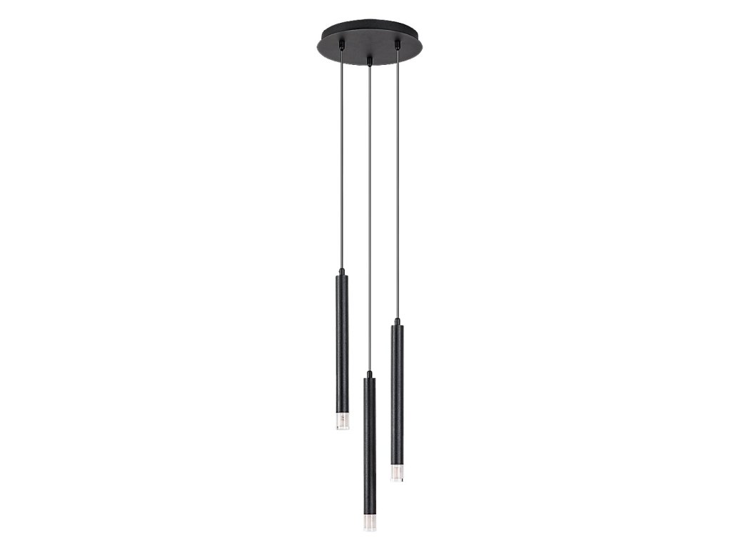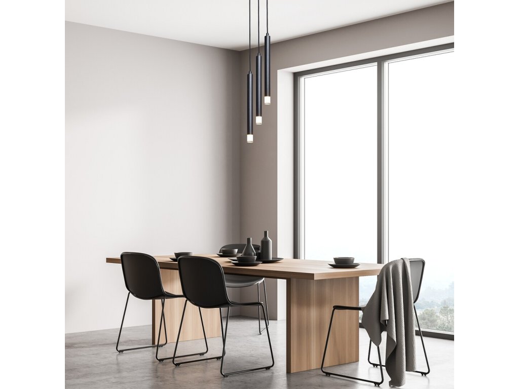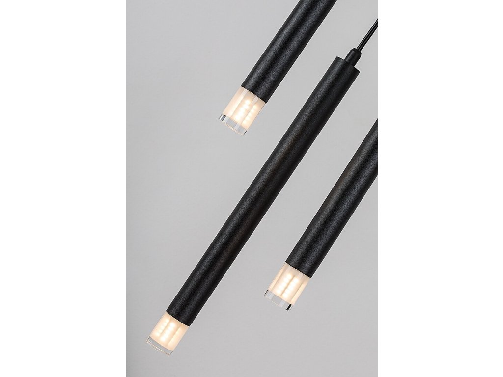 Jednotlivé světelné prvky mají trubicovitý, válcový tvar a jsou vyrobeny z černě lakovaného kovu. Každý z nich je zakončen průhledným akrylovým stínidlem, které zajišťuje přímé a koncentrované vyzařování světla směrem dolů. Díky rozdílným délkám závěsů vzniká atraktivní prostorový efekt, který se uplatní zejména nad jídelním stolem, kuchyňským ostrůvkem nebo jako designový prvek v obývacím pokoji či ložnici.