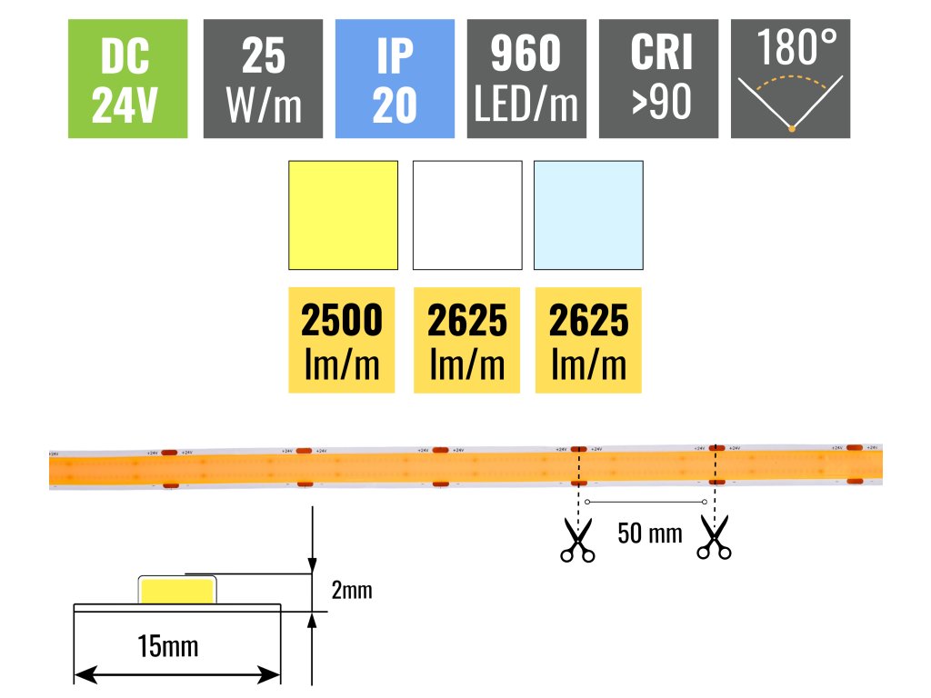 Z výkonu 25W/m pásek vyprodukuje až 2625lm/m. Hustota LED diod je 960ks/m, pásek díky tomu svítí rovnoměrně po celé své délce. Tento pásek je třeba nalepit do hliníkové lišty z důvodu odvodu tepla z LED diod. Všechny naše pásky jsou vybaveny samolepící fólií 3M 300LSE, která skvěle přilne k podkladu. Ten musí být hladký a je třeba ho před lepením pořádně odmastit.