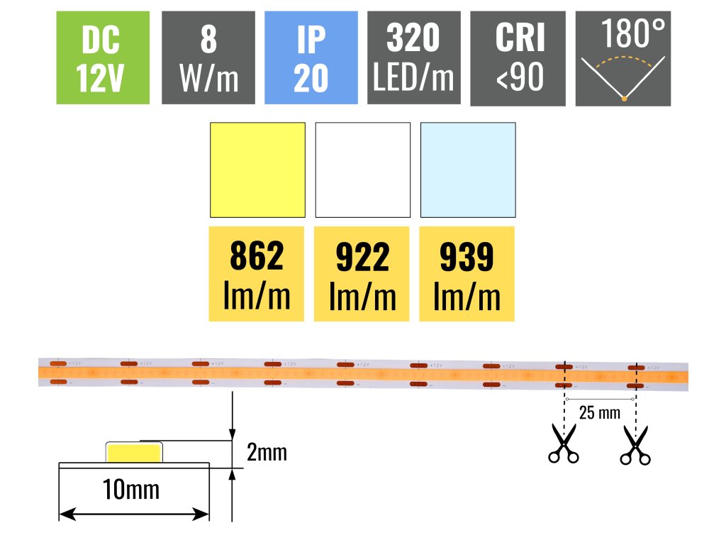 Z výkonu 8W/m pásek vyprodukuje až 939lm/m. Hustota LED diod je 320ks/m, pásek díky tomu svítí rovnoměrně po celé své délce. Tento pásek je třeba nalepit do hliníkové lišty z důvodu odvodu tepla z LED diod. Všechny naše pásky jsou vybaveny samolepící fólií 3M 300LSE, která skvěle přilne k podkladu. Ten musí být hladký a je třeba ho před lepením pořádně odmastit.