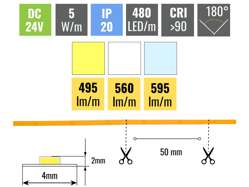 Z výkonu 5W/m pásek vyprodukuje až 595lm/m. Hustota LED diod je 480ks/m, pásek díky tomu svítí rovnoměrně po celé své délce. Tento pásek je třeba nalepit do hliníkové lišty z důvodu odvodu tepla z LED diod. Pásky jsou vybaveny modrou samolepící fólií, která skvěle přilne k podkladu. Ten musí být hladký a je třeba ho před lepením pořádně odmastit.
