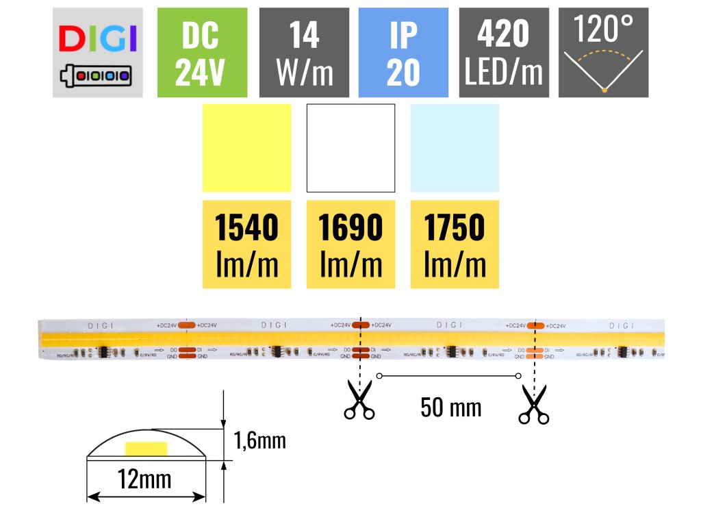 Digitální COB LED pásek 14W/m 24V bez krytí IP20
