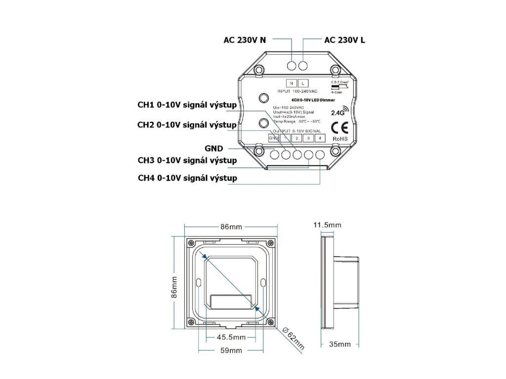 DimLED bezdrátový nástěnný ovladač 0/1-10V 4-kanálový