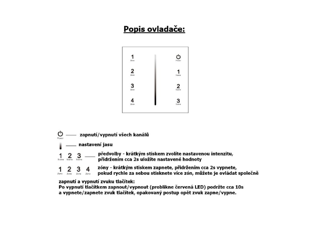 Ovládání probíhá na dotykové lince uprostřed ovladače. Dotykem na lince dochází k nastavování intenzity. Tlačítka na krajích ovladače slouží k dalším možnostem ovládání a vybírání zón.