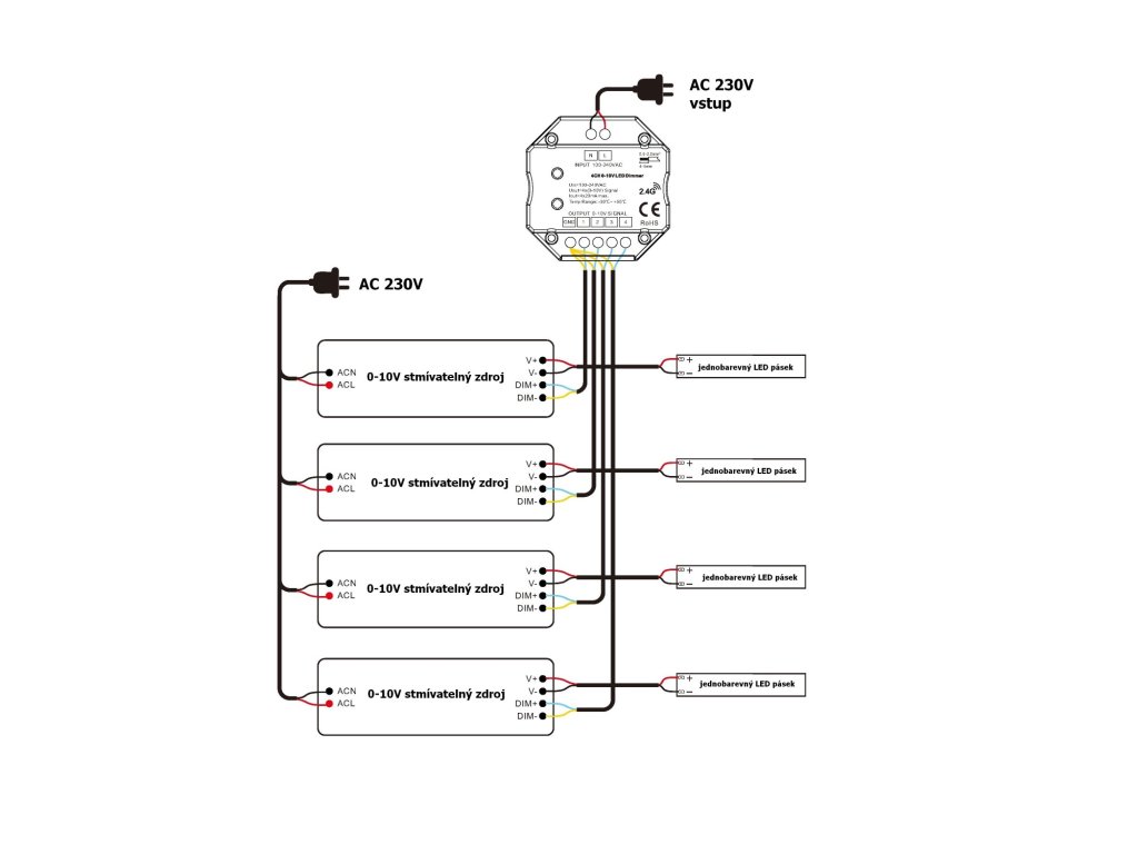 Čtyřkanálový LED ovladač pro jednobarevné osvětlení je bezdrátový radiofrekvenční ovládací systém, jednoho ovladače a několik přijímačů. S jedním ovladačem lze ovládat nezávisle 4 zóny, která se může skládat z několika přijímačů. Tyto přijímače se po sehrání na jednotlivé předvolbě na ovladači ovládají jako jedna sekce. Ovladač také umožňuje ovládat až 4 zařízení se signálem 0-10V, případně 1-10V.