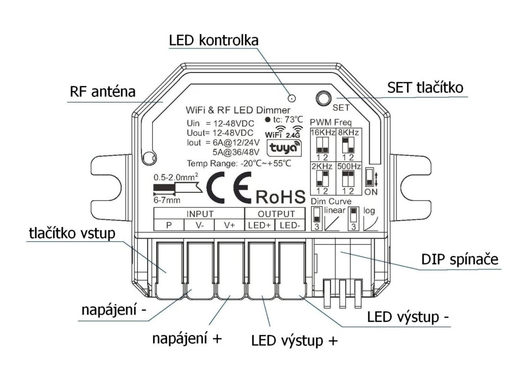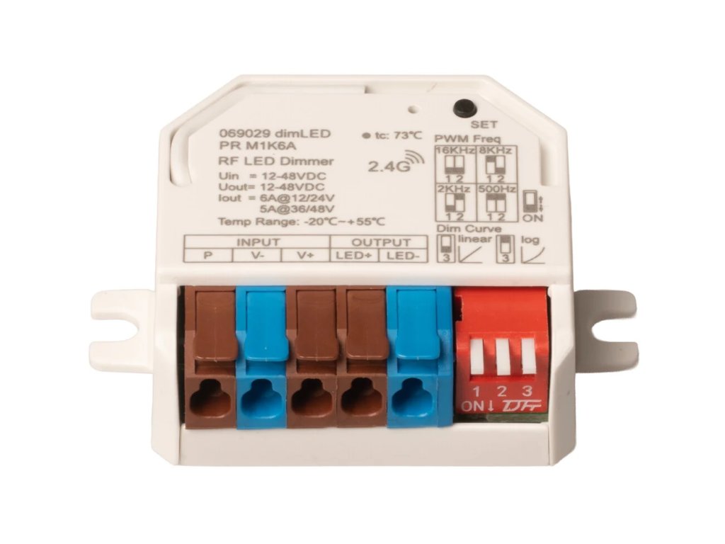 Přijímač je plně kompatibilní se všemi ovladači řady dimLED a umožňuje pohodlné bezdrátové ovládání intenzity osvětlení. Součástí je také svorkovnice pro připojení externího tlačítka, díky čemuž lze světlo ovládat nejen dálkovým ovladačem, ale i klasicky manuálně, například z nástěnného vypínače.
