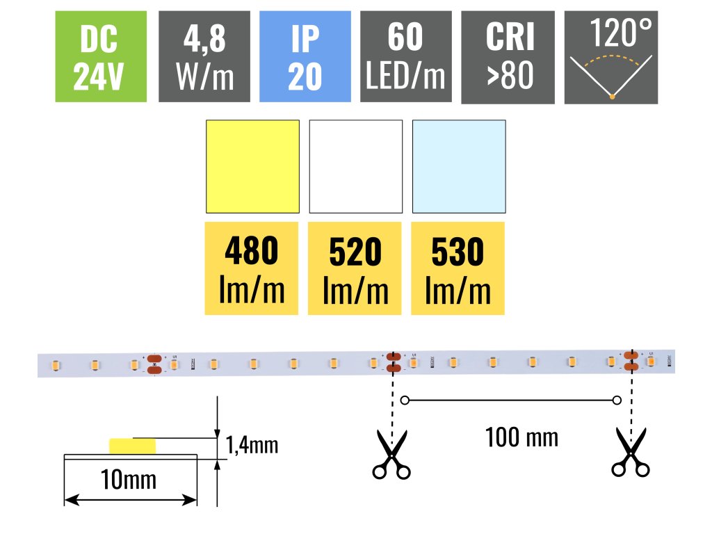 Z výkonu 4,8W/m pásek vyprodukuje až 530lm/m. Hustota LED diod je 60ks/m, pásek díky tomu svítí rovnoměrně po celé své délce. Tento pásek není třeba lepit do hliníkové lišty, přesto doporučujeme tento krok zvážit. Všechny naše pásky jsou vybaveny samolepící fólií 3M 300LSE, která skvěle přilne k podkladu. Ten musí být hladký a je třeba ho před lepením pořádně odmastit.
