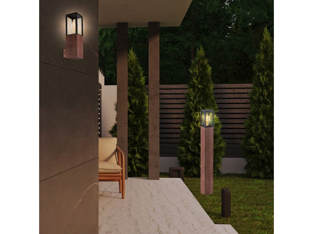 Venkovní nástěnné svítidlo Wales je moderní volbou, která dokonale ladí s dřevěnými prvky na terase či jiných venkovních prostorách. Spodní část svítidla imituje texturu dřeva a elegantně ji doplňuje průhledné skleněné stínítko s matným černým rámem. Toto designové spojení přináší nejen stylový vzhled, ale i praktické osvětlení.