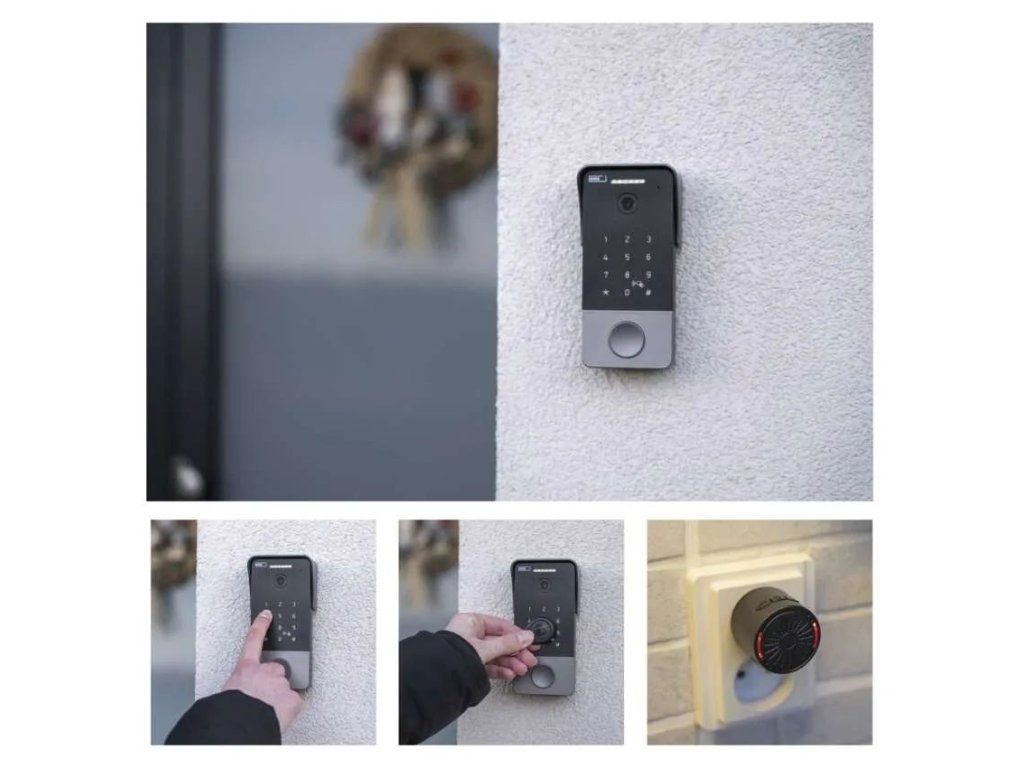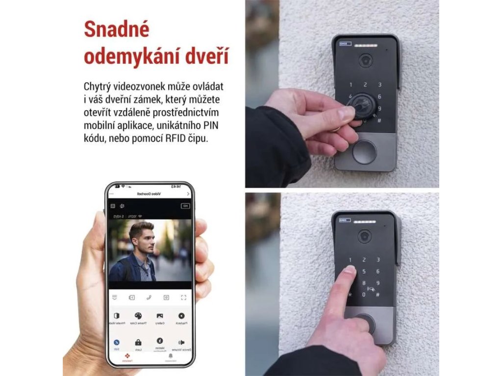 Ovládání dveřního zámku je stejně pohodlné – dveře lze otevřít na dálku přes aplikaci, zadáním PIN kódu na podsvícené dotykové klávesnici, nebo pomocí přiložené RFID čipové klíčenky. V případě potřeby lze připojit i více vnitřních zvonků s dosahem až 150 m, díky čemuž nepřeslechnete žádné zazvonění ani v odlehlejších částech domu.