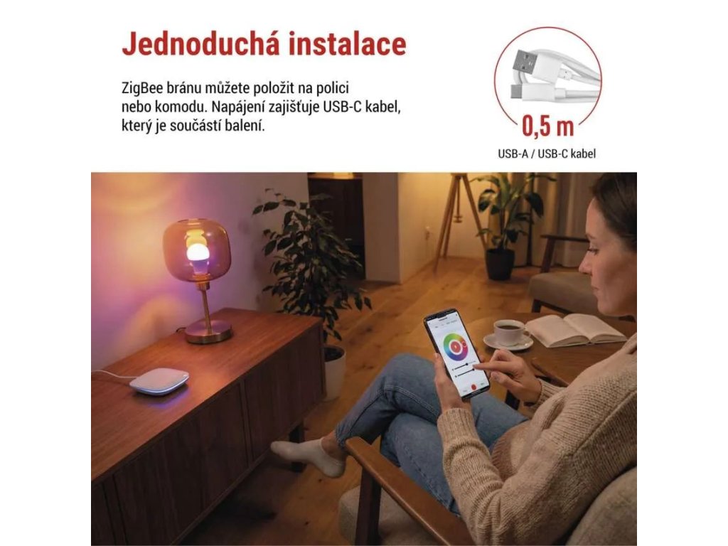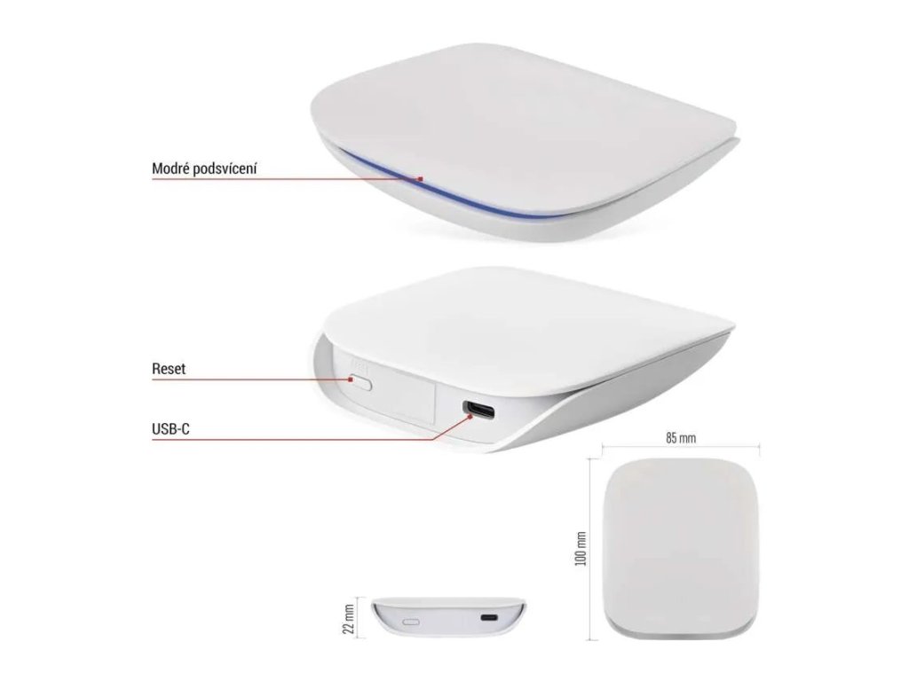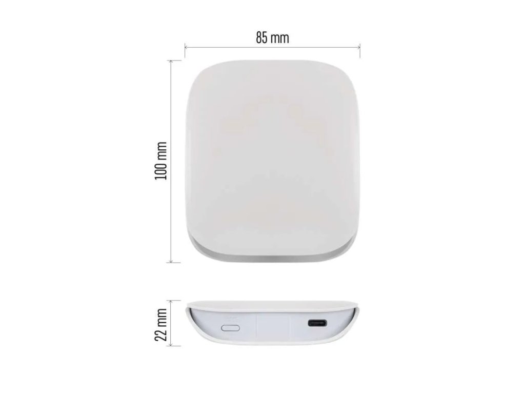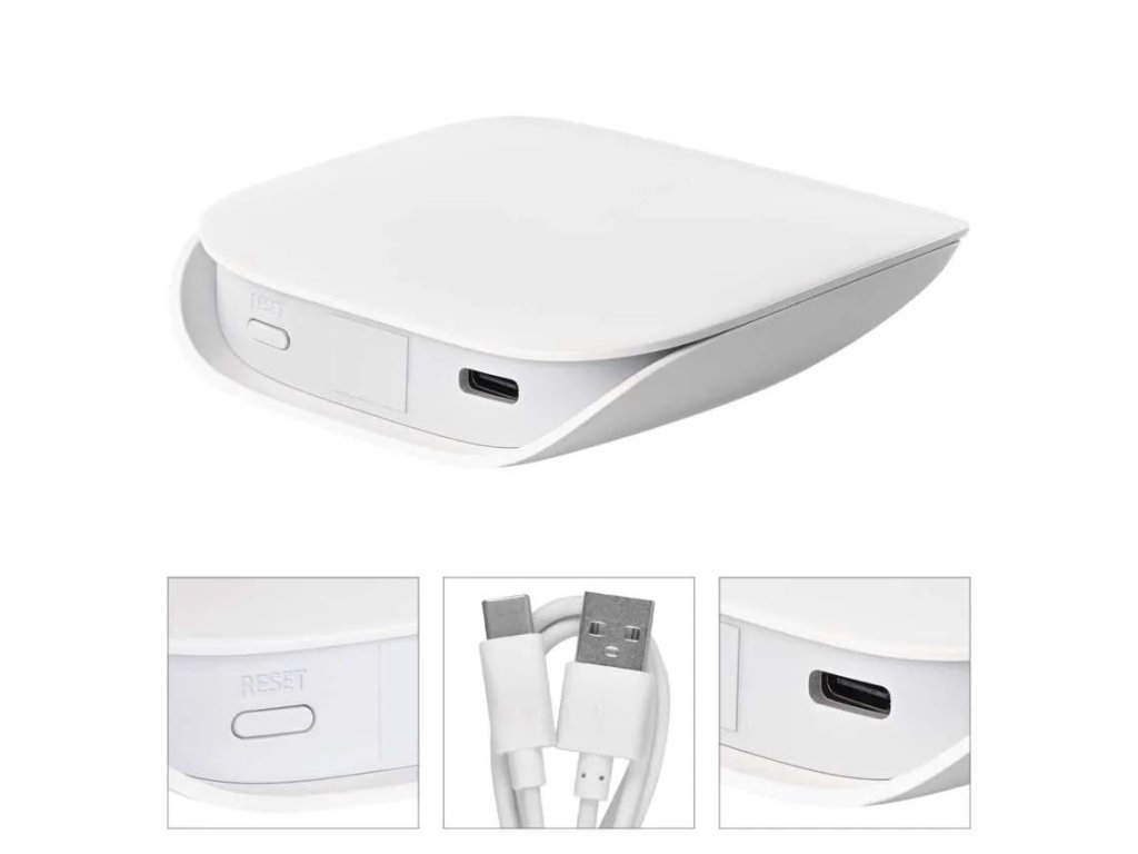 Kompaktní provedení umožňuje snadné umístění na stůl, poličku nebo skříň, případně ji lze napájet i pomocí powerbanky. Napájení zajišťuje přiložený USB-C kabel, takže instalace je rychlá a bez složitého zapojení. Brána se tak stává ideálním základem pro budování moderní chytré domácnosti, která reaguje na vaše potřeby automaticky.