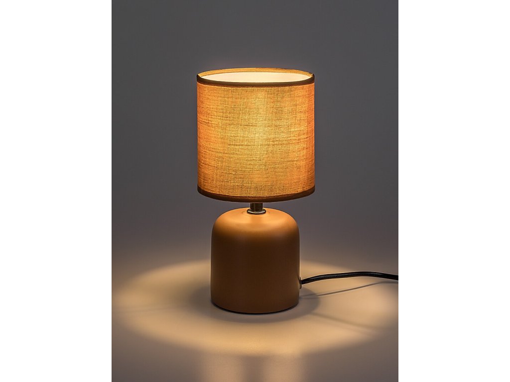 Tělo lampičky je vyrobeno z hnědé keramiky a doplňuje jej válcové textilní stínidlo, které je otevřené shora i zdola. Díky tomu světlo příjemně prosvítá a rovnoměrně osvětluje okolní prostor.