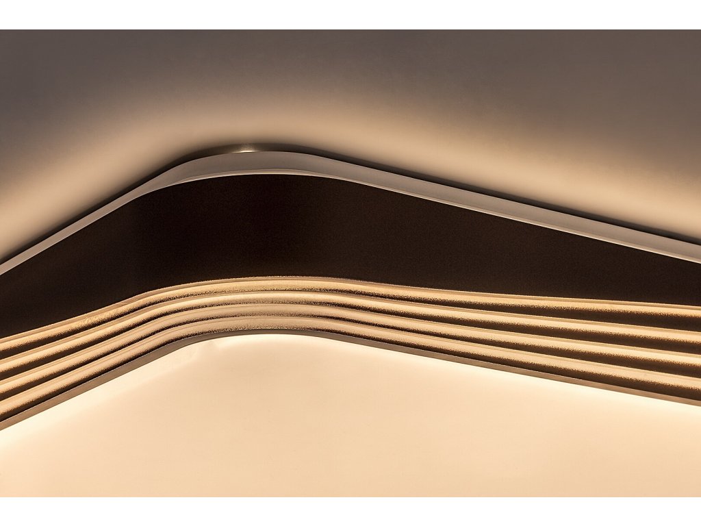 Stropní svítidlo Druzor zaujme moderním designem a důrazem na detail, díky čemuž se stává výrazným, ale zároveň elegantním prvkem interiéru. Čtvercový tvar se zaoblenými rohy doplňuje hnědá kovová základna, jejíž boční strany jsou zvýrazněny jemným dekorativním pruhováním. Tento prvek vytváří po rozsvícení atraktivní světelný efekt a dodává svítidlu osobitý charakter. Bílé plastové stínítko zajišťuje rovnoměrné a příjemné rozptýlení světla po celé ploše.