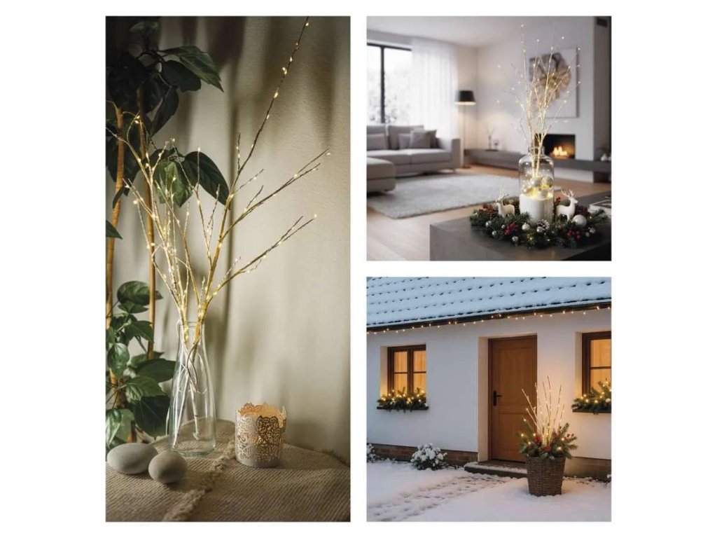 Napájení na tři tužkové baterie AA umožňuje umístění kamkoliv bez nutnosti řešit zásuvky nebo viditelné kabely. Větve se dají jednoduše naaranžovat do vázy, položit na komodu, doplnit o další dekorace nebo použít jako osvětlení na parapetu či v okenním truhlíku. Bateriový box je chráněný gumovým těsněním, takže lze osvětlení bez obav použít také venku.