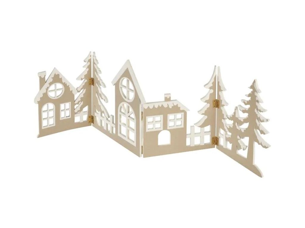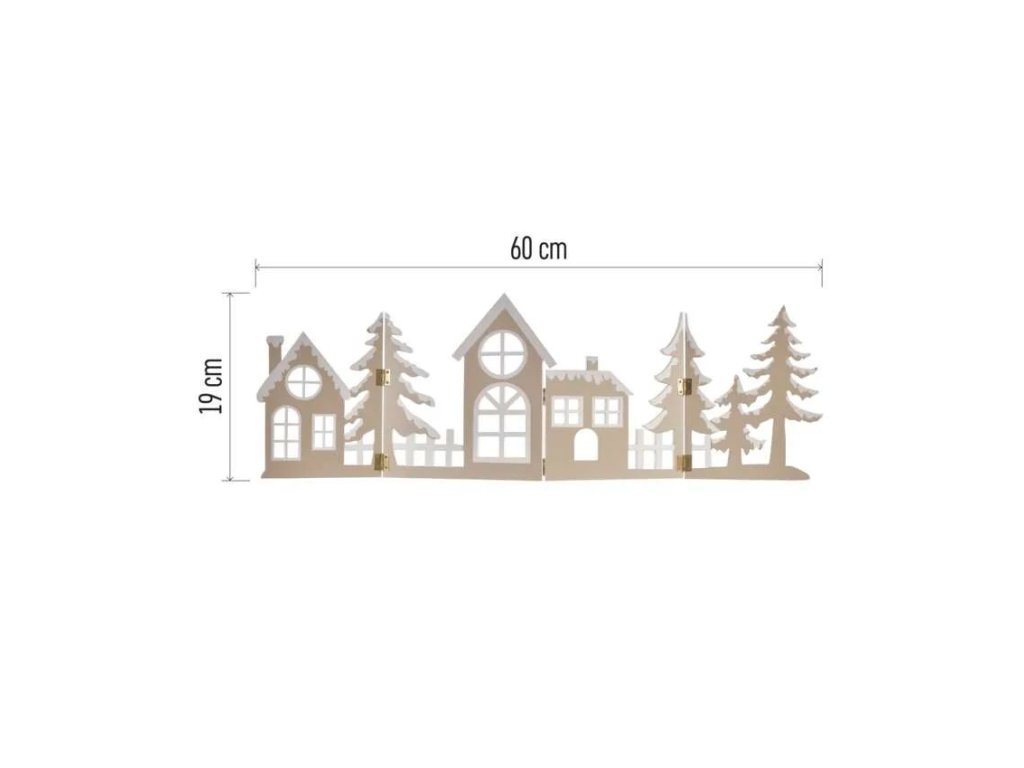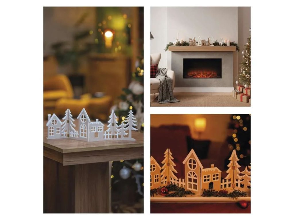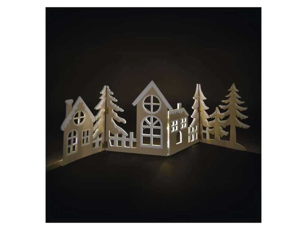 Stylová dřevěná dekorace ve tvaru malé zimní vesničky vnese do domova jemné, útulné světlo i přírodní atmosféru. Precizně vyřezávané domky, stromy a ploty vytvářejí dojem zasněžené krajiny, kterou po rozsvícení oživí 40 teple bílých LED diod. Světlo příjemně prosvítá okny domků a mezi větvemi stromů, takže dekorace působí kouzelně jak ve dne, tak i večer při tlumeném osvětlení.