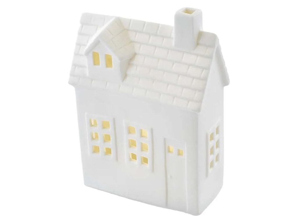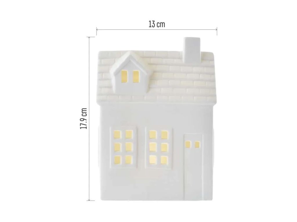 Keramický domeček s jemným LED podsvícením v teplé bílé barvě vytváří klidnou zimní atmosféru a působí elegantně i ve chvíli, kdy nesvítí. Světlo prostupuje drobnými okénky a dodává dekoraci příjemný hřejivý efekt, díky kterému se stane krásným doplňkem okenního parapetu, komody i poličky. Vestavěný časovač automaticky zapíná světlo na 6 hodin a následně jej na 18 hodin vypíná, takže se domeček každý den rozsvítí ve stejnou dobu bez nutnosti dalšího nastavování. Napájení z ploché baterie CR2032, která je součástí balení, umožňuje umístění dekorace kamkoli bez kabelů a bez potřeby zásuvky.