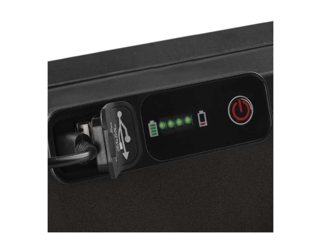 Světelný tok je možné regulovat ve třech krocích – 100%, 50% a 25%, což se hodí při různých činnostech nebo šetření baterie. Široký úhel svícení 120° zajišťuje dostatečné osvětlení i větších ploch a studená bílá barva světla s teplotou 6 500 K přispívá k maximální viditelnosti i při náročnějších podmínkách. Díky skládací konstrukci reflektor snadno přenesete nebo uložíte. Praktickým bonusem je USB-C výstup, přes který lze dobíjet například mobilní telefon nebo jiná zařízení. Ovládací panel na zadní straně obsahuje přehledný indikátor stavu nabití a spínač.