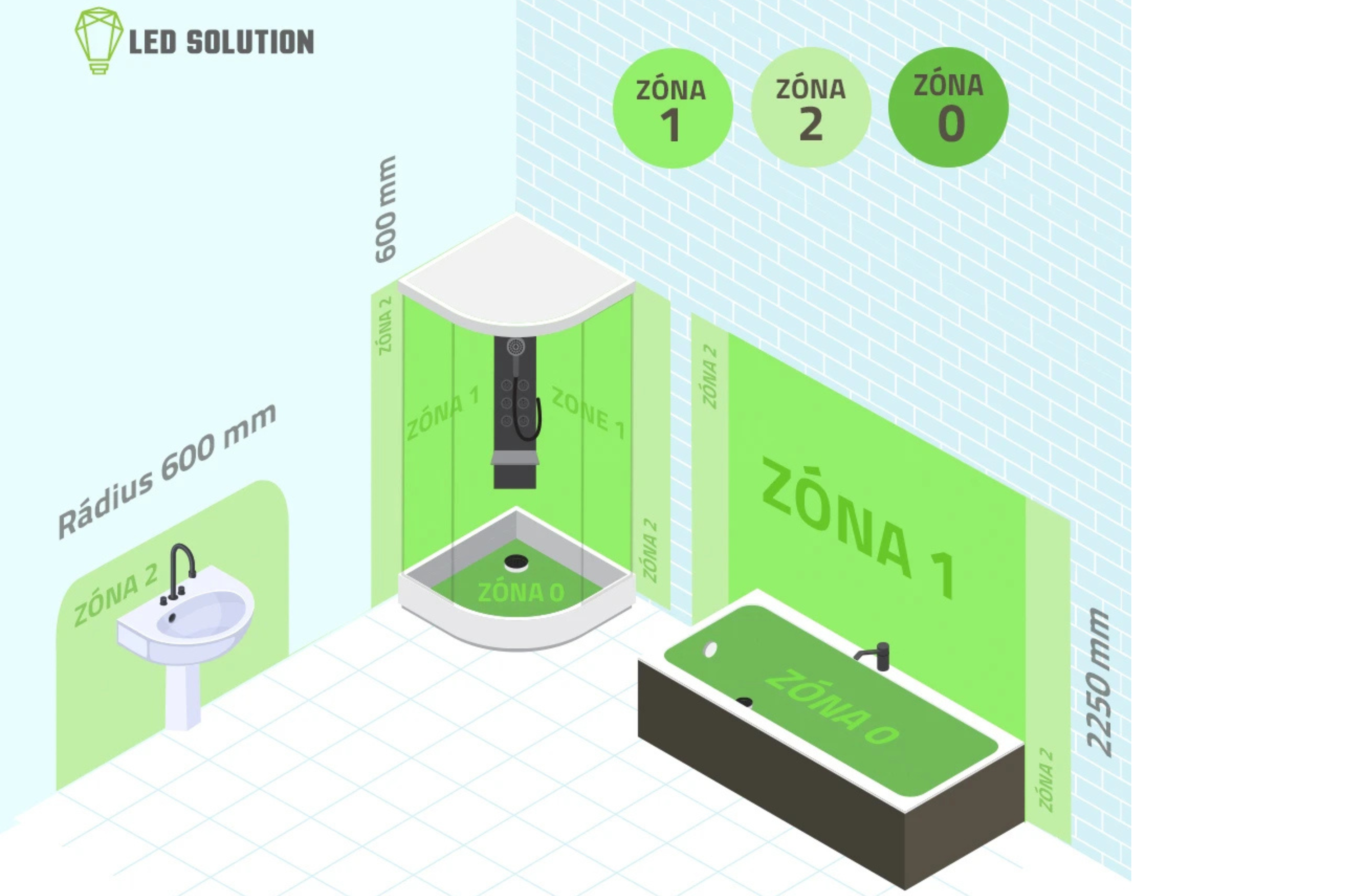 - Zóna 0 zahrnuje vnitřní prostor vany nebo sprchy, kde je svítidlo přímo vystaveno vodě. Použít zde lze pouze zařízení s velmi nízkým napětím a krytím IPX7, typicky například u vířivek nebo sprchových panelů.
