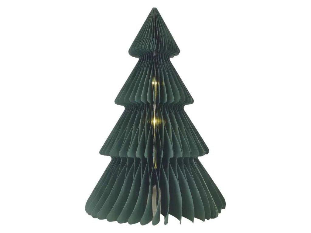 Papírový vánoční stromeček v moderním zeleném provedení vytváří příjemné světelné kouzlo díky deseti teplým bílým LED diodám. Díky skládacímu designu a snadnému spojení pomocí magnetů se pohodlně skladuje a rychle připraví k použití. Napájení na tři tužkové baterie AA umožňuje umístění kamkoli bez kabelů a vestavěný časovač se postará o automatické svícení po dobu 6 hodin a následné 18hodinové vypnutí. Stromeček je určen pro vnitřní použití a skvěle doplní stůl, polici i okenní parapet. Baterie nejsou součástí balení.