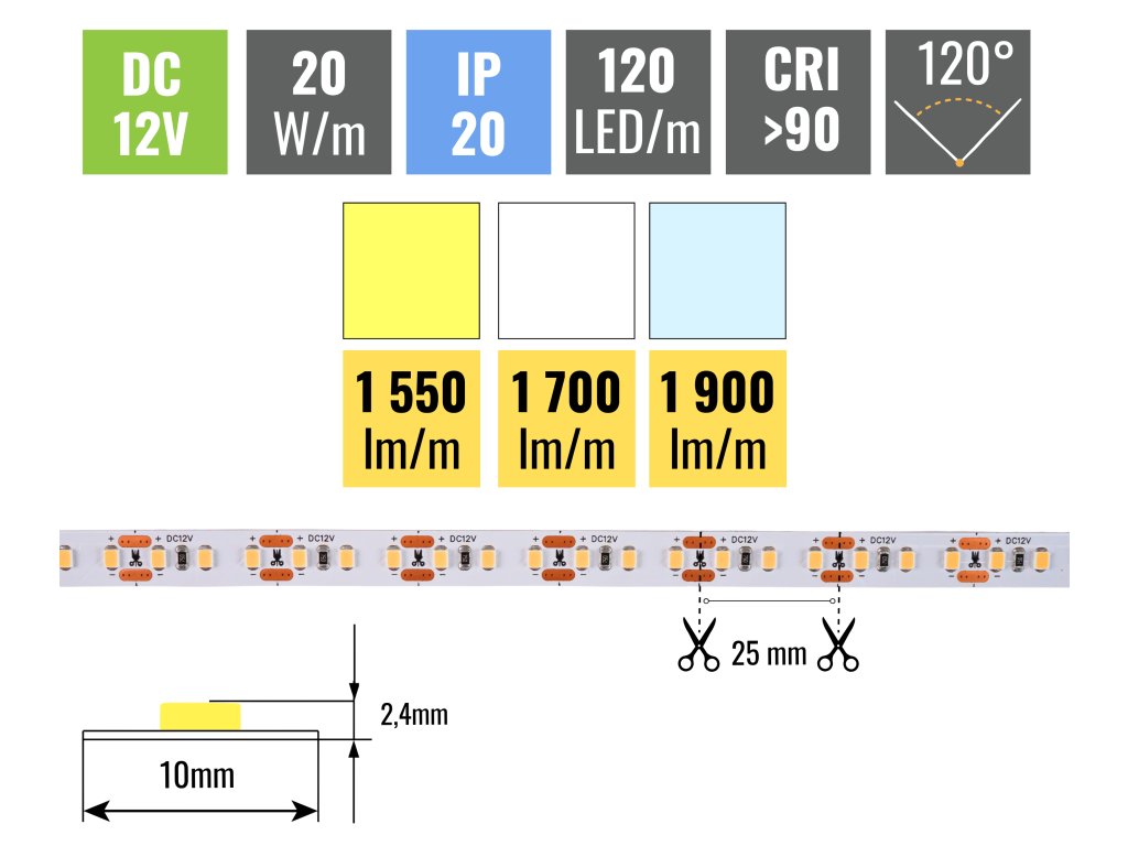Z výkonu 12W/m pásek vyprodukuje až 1300lm/m. Hustota LED diod je 60ks/m, pásek díky tomu svítí rovnoměrně po celé své délce. Tento pásek je třeba nalepit do hliníkové lišty z důvodu odvodu tepla z LED diod. Všechny naše pásky jsou vybaveny samolepící fólií 3M 300LSE, která skvěle přilne k podkladu. Ten musí být hladký a je třeba ho před lepením pořádně odmastit.
