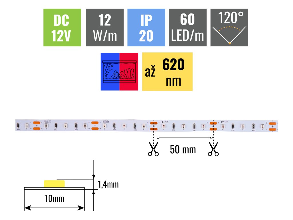 Speciální LED pásek vhodný pro osvětlení akvárii kombinuje LED modré a červené barvy. Hustota LED diod je 60ks/m, pásek díky tomu svítí rovnoměrně po celé své délce. Tento pásek je třeba nalepit do hliníkové lišty z důvodu odvodu tepla z LED diod. Všechny naše pásky jsou vybaveny samolepící fólií 3M 300LSE, která skvěle přilne k podkladu. Ten musí být hladký a je třeba ho před lepením pořádně odmastit.