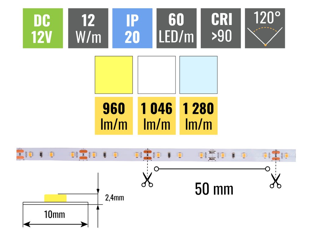 Z výkonu 12W/m pásek vyprodukuje až 1280lm/m. Hustota LED diod je 60ks/m, pásek díky tomu svítí rovnoměrně po celé své délce. Tento pásek je třeba nalepit do hliníkové lišty z důvodu odvodu tepla z LED diod. Všechny naše pásky jsou vybaveny samolepící fólií 3M 300LSE, která skvěle přilne k podkladu. Ten musí být hladký a je třeba ho před lepením pořádně odmastit.