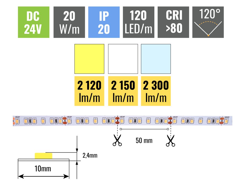 Z výkonu 20W/m pásek vyprodukuje až 2300lm/m. Hustota LED diod je 120ks/m, pásek díky tomu svítí rovnoměrně po celé své délce. Tento pásek je třeba nalepit do hliníkové lišty z důvodu odvodu tepla z LED diod. Všechny naše pásky jsou vybaveny samolepící fólií 3M 300LSE, která skvěle přilne k podkladu. Ten musí být hladký a je třeba ho před lepením pořádně odmastit.