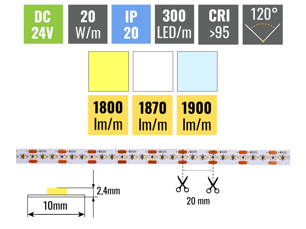 Z výkonu 20W/m pásek vyprodukuje až 1900lm/m. Hustota LED diod je 300ks/m, pásek díky tomu svítí rovnoměrně po celé své délce. Tento pásek je třeba nalepit do hliníkové lišty z důvodu odvodu tepla z LED diod. Všechny naše pásky jsou vybaveny samolepící fólií 3M 300LSE, která skvěle přilne k podkladu. Ten musí být hladký a je třeba ho před lepením pořádně odmastit.