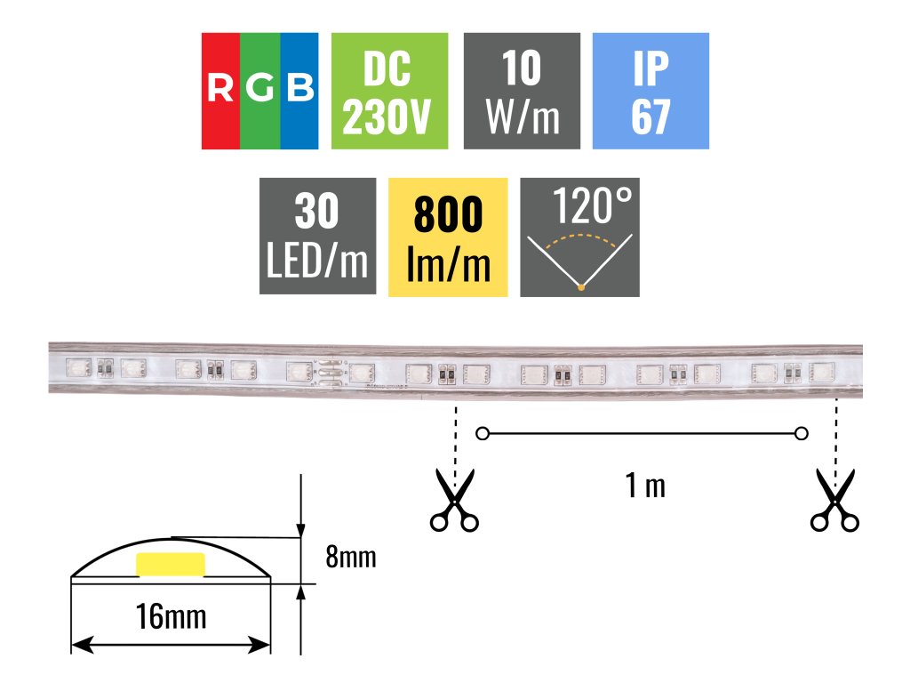 LED pásky 230V jsou vhodné pro použití jak venku, tak vevnitř. Pásek lze dělit pouze po celých metrech a jsou v originálních rolích po 50 metrech, jedním kabelem je možné zapojit až 50m pásku. Ani při zapojení 50m pásku nedochází k úbytku svítivosti.