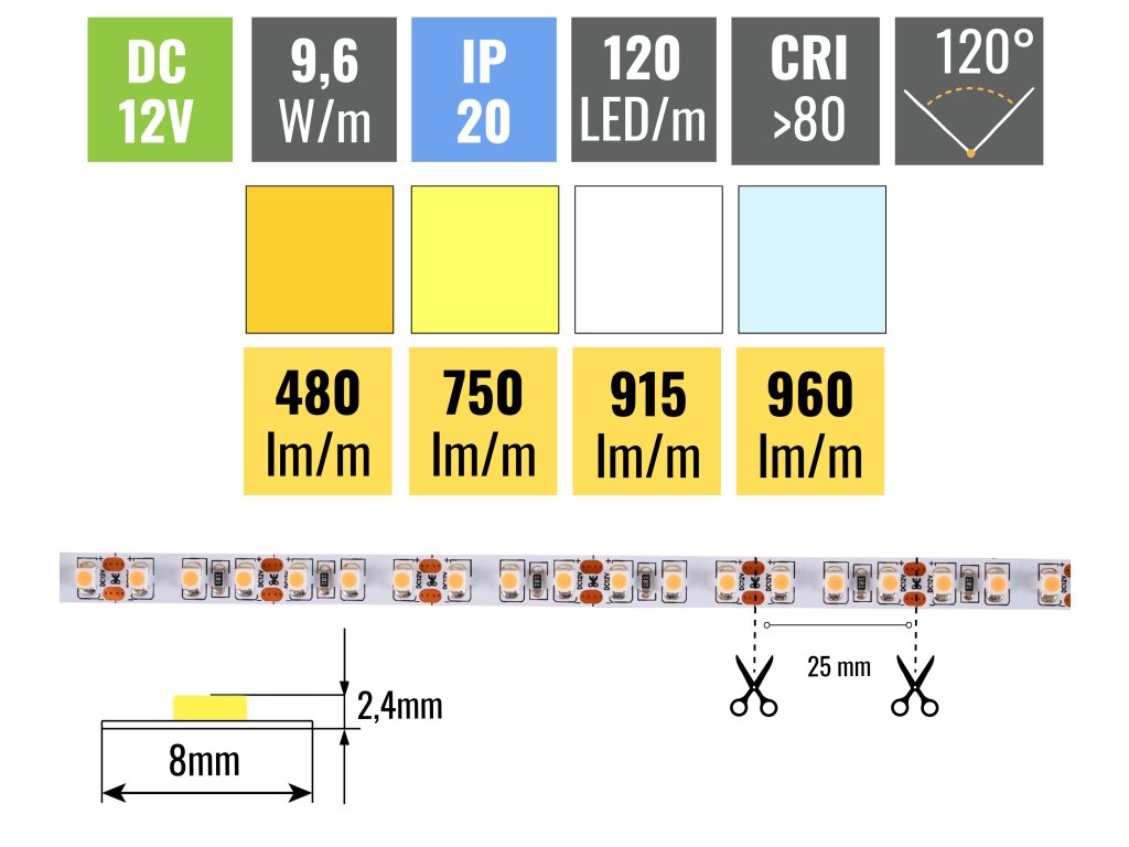 Z výkonu 9,6W/m pásek vyprodukuje až 960lm/m. Hustota LED diod je 120ks/m, pásek díky tomu svítí rovnoměrně po celé své délce. Tento pásek je třeba nalepit do hliníkové lišty z důvodu odvodu tepla z LED diod. Všechny naše pásky jsou vybaveny samolepící fólií 3M 300LSE, která skvěle přilne k podkladu. Ten musí být hladký a je třeba ho před lepením pořádně odmastit.