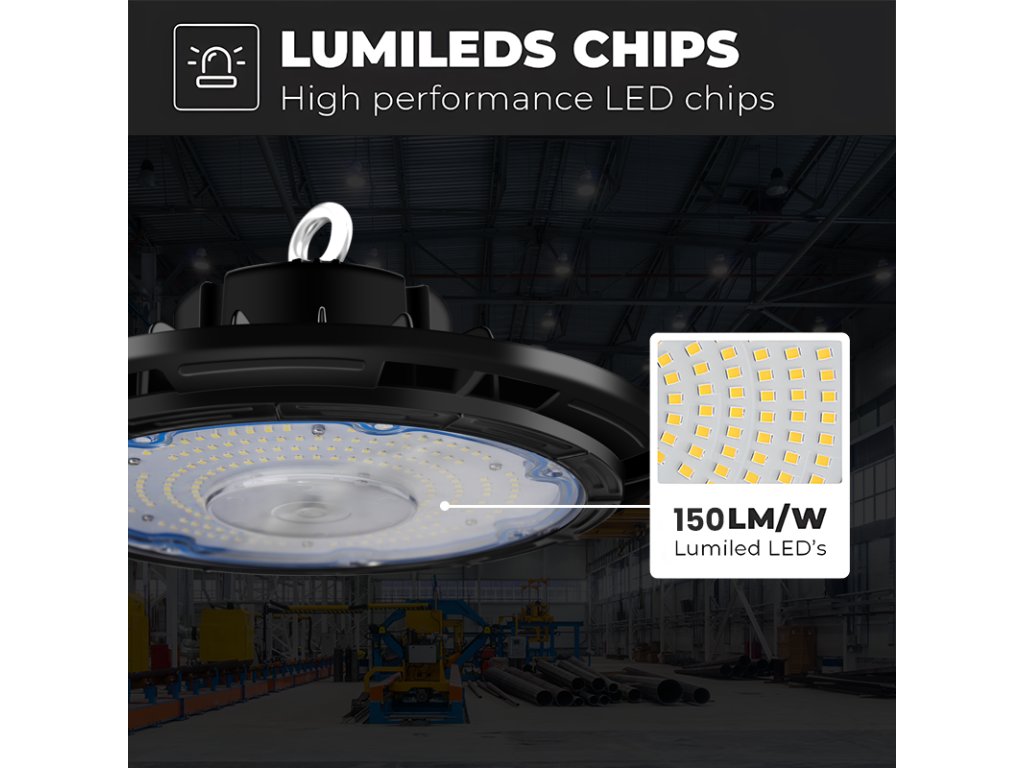 Závěsné LED svítidlo typu UFO High-bay je určeno pro osvětlení prostor s vysokými stropy, jako jsou výrobní haly, sklady, dílny, sportoviště nebo obchodní prostory. Díky krytí IP65 je odolné proti vlhkosti a prachu, takže spolehlivě funguje i v náročném prostředí.