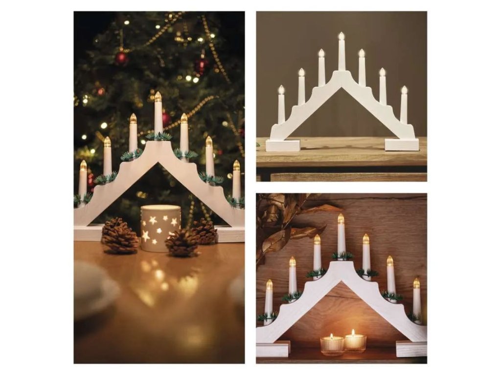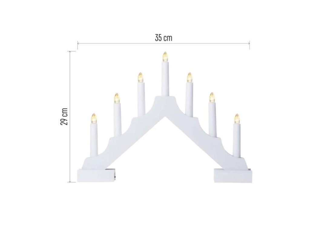 LED svícen v bílé dřevěné úpravě vytváří příjemnou vánoční atmosféru a skvěle se hodí na stůl, parapet i poličku. Sedm svíček svítí teplou bílou barvou, která působí útulně a elegantně. Napájení pomocí dvou tužkových baterií AA umožňuje umístění kamkoli bez viditelných kabelů. Praktický časovač zajistí automatické svícení po dobu 6 hodin a následné 18hodinové vypnutí, takže se o osvětlení nemusíte starat. Svícen je určen pro vnitřní použití.