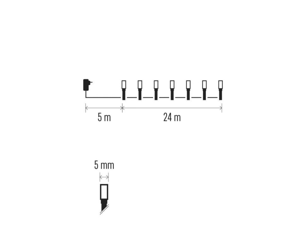 LED vánoční řetěz teplá bílá o délce 24m vhodný do venkovních i vnitřních prostor. Vhodný pro strom vysoký 2,3m.