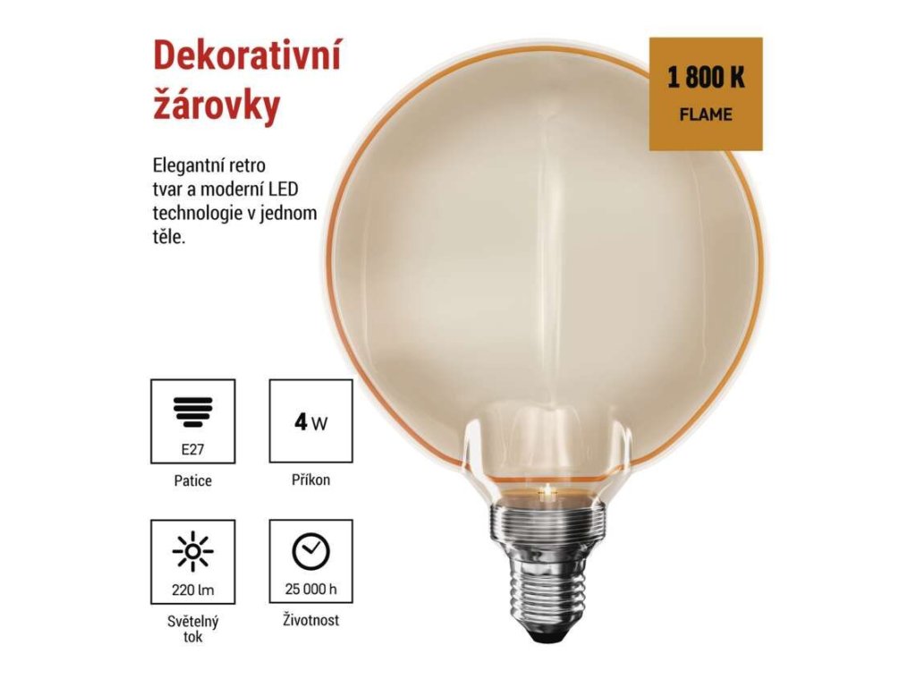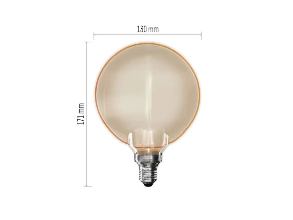 LED filamentová žárovka ve tvaru G130 má výkon 4 W a poskytuje světelný tok 220 lumenů. Díky příjemnému jantarovému odstínu skla se stane jedinečným dekorativním prvkem každého interiéru. Skvěle se hodí do otevřených svítidel, závěsných lustrů nebo jako samostatně zavěšená dekorace, která zaručeně upoutá pozornost. Díky vyzařovacímu úhlu 330° rovnoměrně rozptyluje světlo do celého prostoru. Je vybavena paticí E27, kterou můžete bez problémů použít ve všech běžných svítidlech s touto paticí.