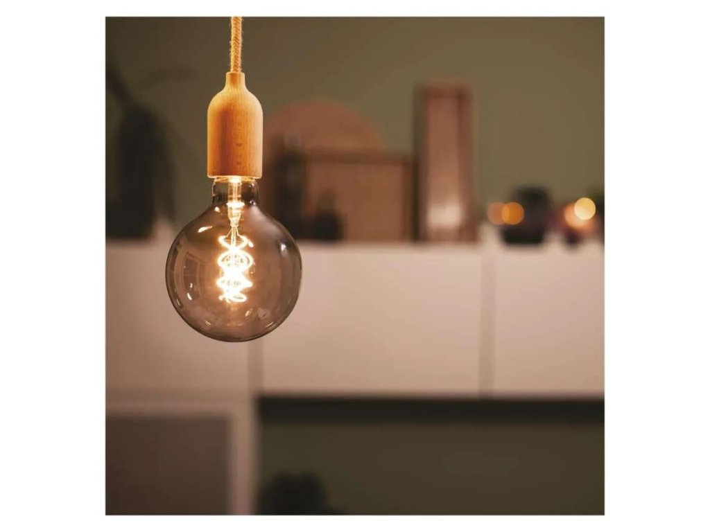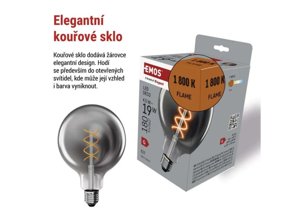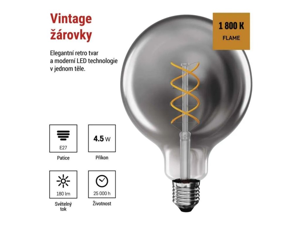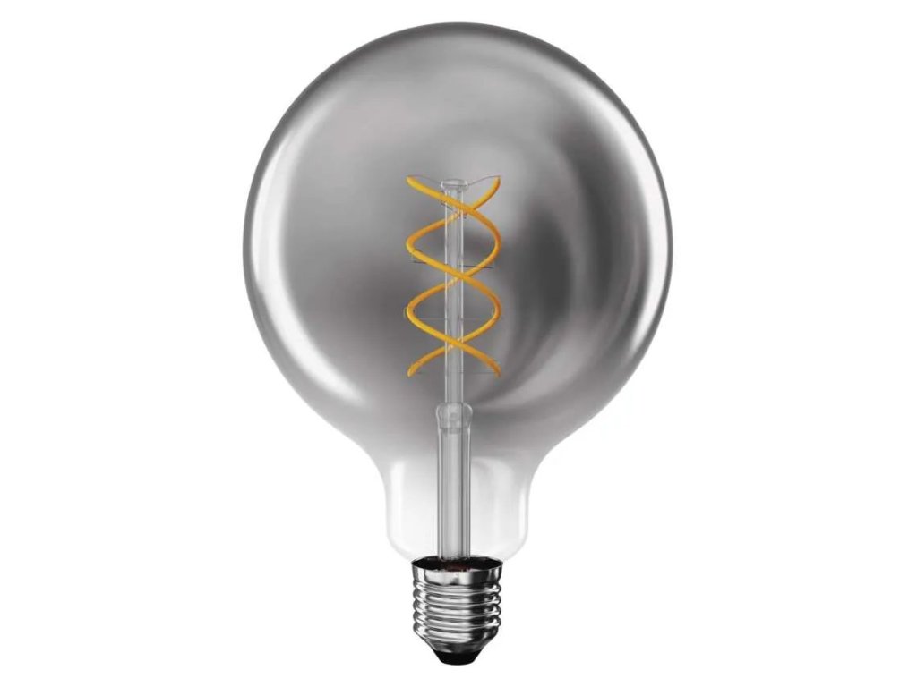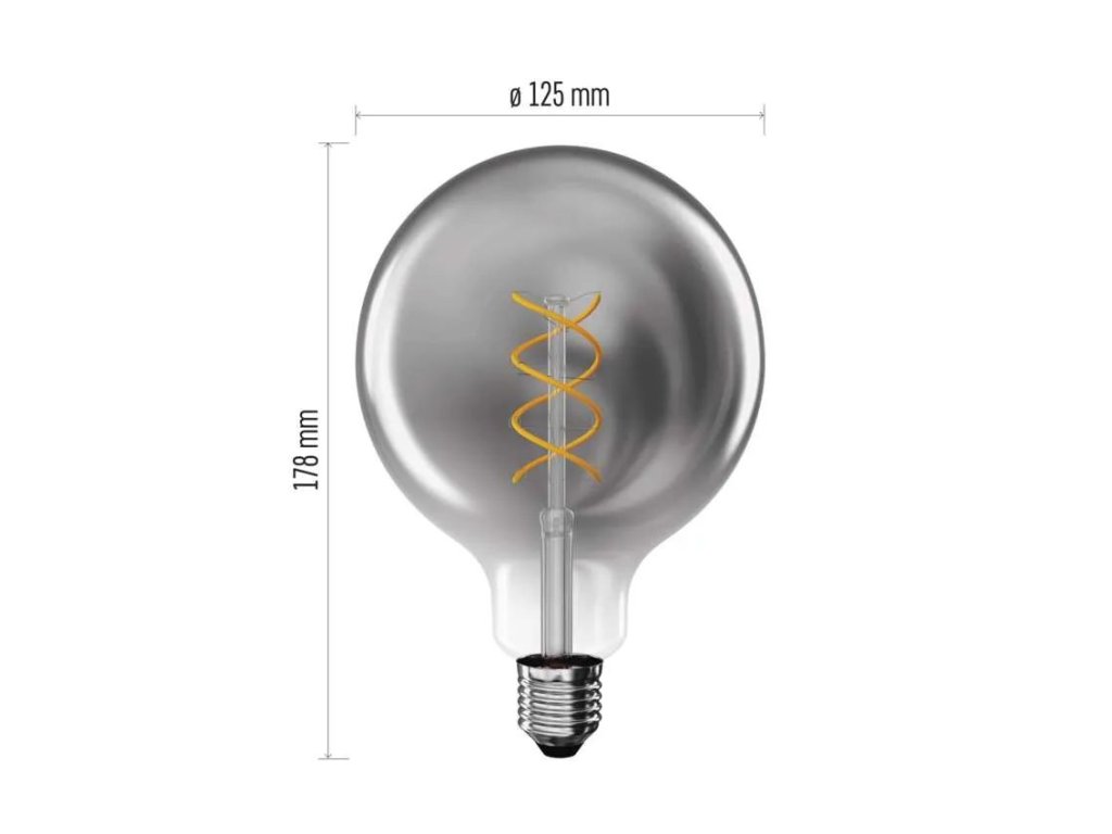 LED filamentová žárovka s kouřovým sklem ve tvaru G125 má výkon 4,5 W a poskytuje světelný tok 180 lumenů, což ji předurčuje pro příjemné osvětlení interiéru nebo jako designový doplněk do lamp, lustrů a dalších dekorativních svítidel. Díky vyzařovacímu úhlu 320° rovnoměrně rozptyluje světlo do celého prostoru. Je vybavena paticí E27, kterou můžete bez problémů použít ve všech běžných svítidlech s touto paticí.