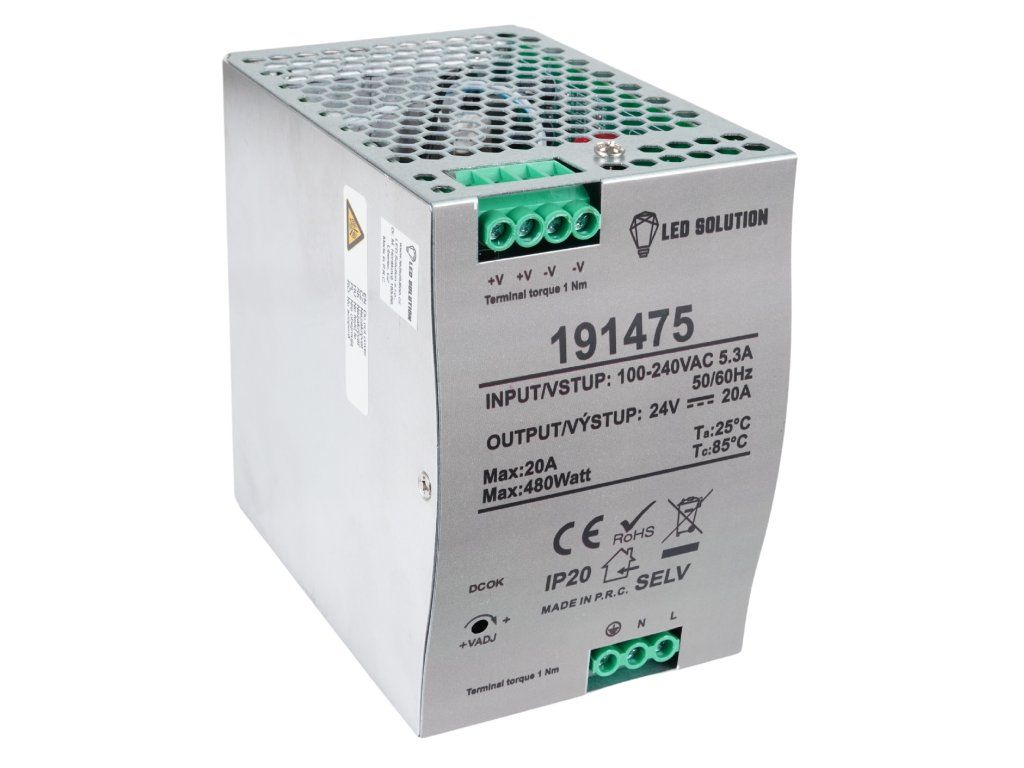 LED elektronický spínaný zdroj pro LED pásky s výkonem 480W určený pro vnitřní použití. Konstrukce umožňuje uchycení na DIN lištu přímo do rozvaděče. Zdroj je vybaven tepelnou ochranou, ochranou proti zkratu i proti přetížení a nabízí možnost manuálního doladění výstupního napětí v rozsahu ±10%.