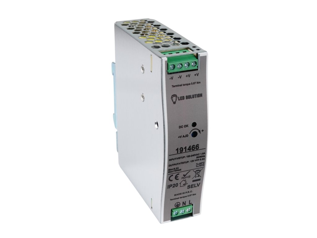 LED elektronický spínaný zdroj pro LED pásky s výkonem 75W určený pro vnitřní použití. Konstrukce umožňuje uchycení na DIN lištu přímo do rozvaděče. Zdroj je vybaven tepelnou ochranou, ochranou proti zkratu i proti přetížení a nabízí možnost manuálního doladění výstupního napětí v rozsahu ±10%.