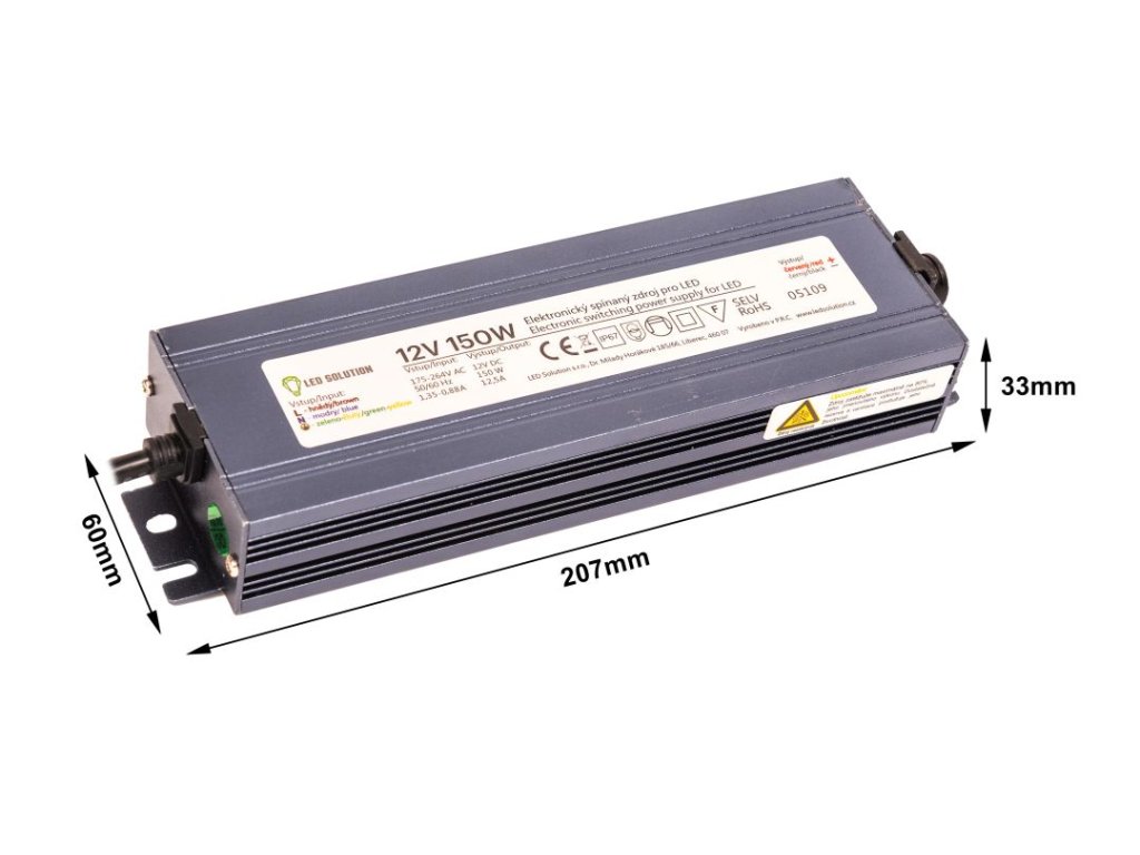 Voděodolné elektronicky spínané zdroje slouží pro napájení LED svítidel. Převádějí napětí ze sítě (AC 230V) na nízké napětí (DC 12V / 12,5A). Zdroje jsou opatřeny tepelnou pojistkou, pojistkou proti přetížení a pojistkou proti zkratu. Po odstranění zkratu je zdroj plně funkční.