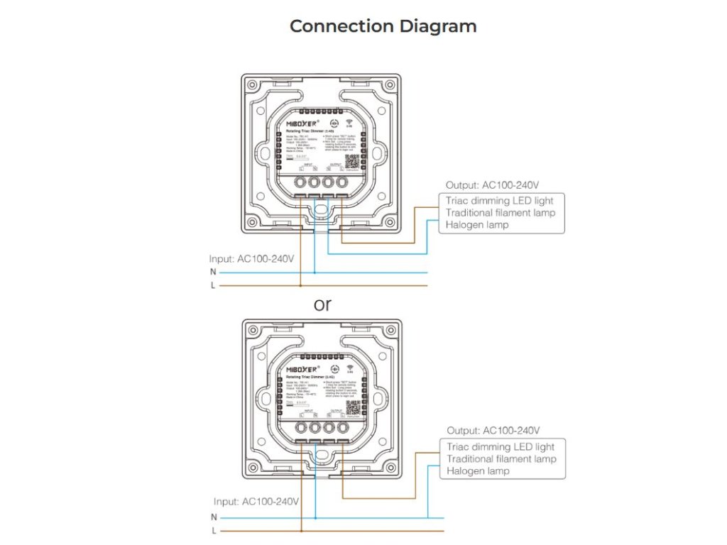 Otočný triakový stmívač a přijímač Mi-Light / MiBoxer je určen pro stmívatelná LED svítidla a žárovky napájené ze sítě AC 230V. Nabízí možnost ovládání jak dálkově prostřednictvím ovladačů řady Mi-Light, tak i manuálně pomocí otočného kolečka. Stmívač/přijímač může být ukrytý (za zdí, sádrokartónem či ve skříni), není nutná přímá viditelnost přijímače pro ovladač.