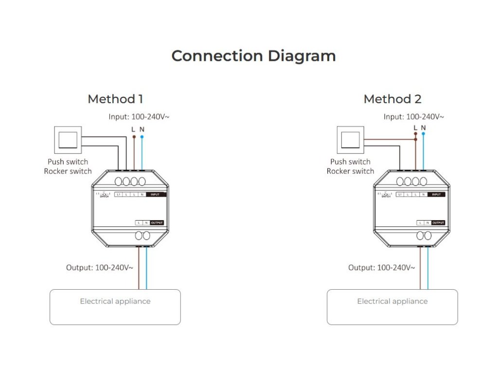 Spínač Mi-Light / MiBoxer umožňuje zapínání a vypínání zařízení na 230V - LED svítidel, klasických žárovek, halogenových svítidel, topných těles, ventilátorů, elektrických krbů či jiných domácích spotřebičů.