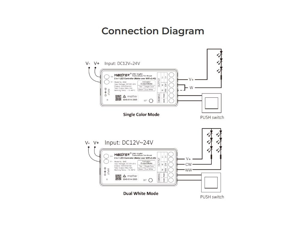 Přijímač podporuje dva provozní režimy – režim pro jednobarevné LED pásky a režim pro CCT LED pásky s teplou a studenou bílou. Volba režimu se provádí přímo na zařízení.