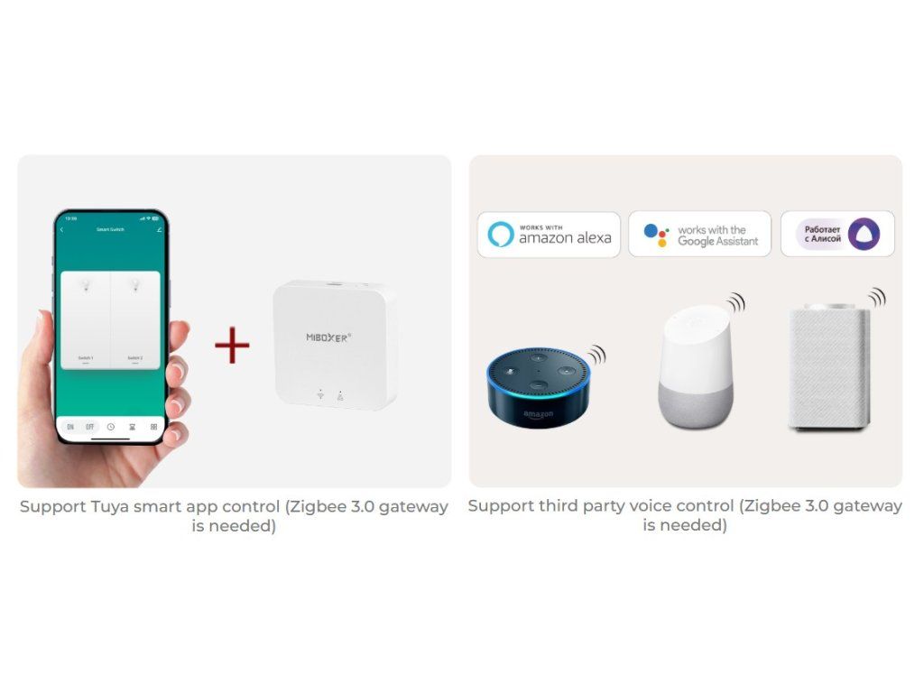 Ovládání je možné přímo tlačítky na panelu, pomocí RF dálkového ovladače nebo přes mobilní aplikaci Tuya. Pro ovládání přes aplikaci a hlasové asistenty je nutné zakoupit Zigbee 3.0 bránu, která zařízení propojí s vaší sítí.