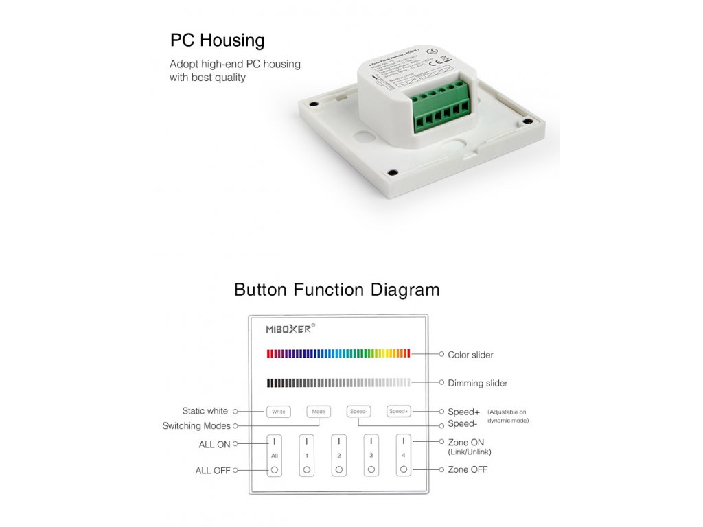 Dálkový nástěnný ovladač Mi-Light s napájením AC 230V pro RGB a RGBW LED pásky je bezdrátový radiofrekvenční ovládací systém produktů řady Mi-Light / MiBoxer. S jedním ovladačem lze ovládat 4 zóny osvětlení, které se můžou skládat z několika přijímačů. Tyto přijímače se po sehrání s ovladačem ovládají jako jedna sekce. Pro RGB osvětlení je nutné dokoupit Mi-Light RGB přijímač, pro RGBW osvětlení zase Mi-Light RGBW přijímač.