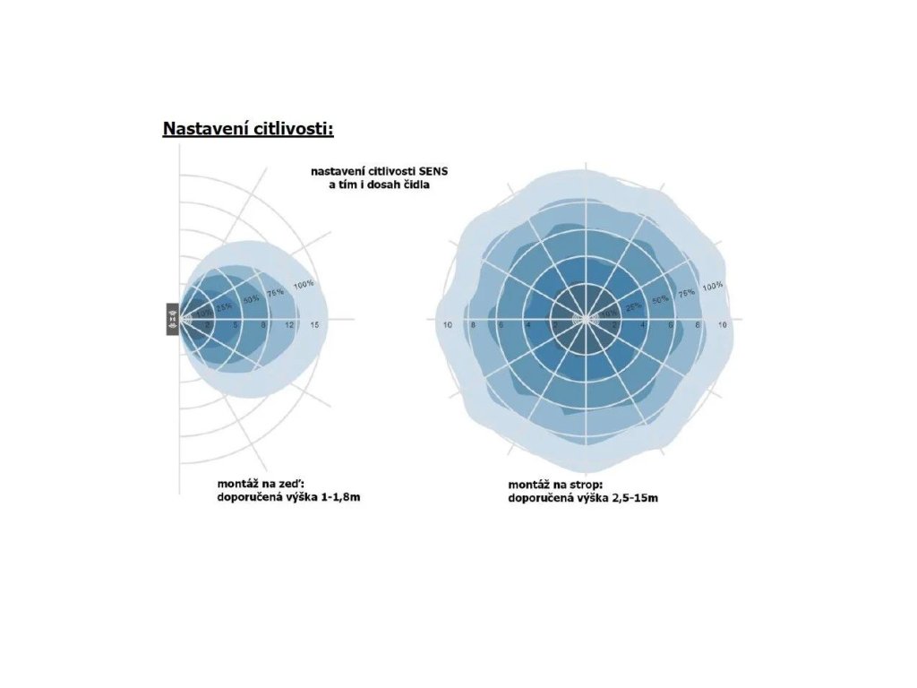 Snímané pole (dosah) čidla je nastavitelné 10-100%, změnu dosahu čidla dle nastavení najdete v galerii, maximální dosah čidla je 20m. Na čidle lze nastavit dobu sepnutí od 10 vteřin do 30 minut a citlivost na světlo (soumrakové nastavení) od 10 do 200 luxů, případně lze citlivost na světlo vypnout.