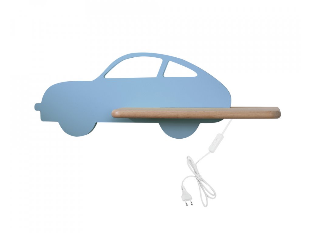 Nástěnné svítidlo je vyrobené ze dřeva s motivem auta modré barvy, které je doplněno o napájecí kabel se spínačem.
