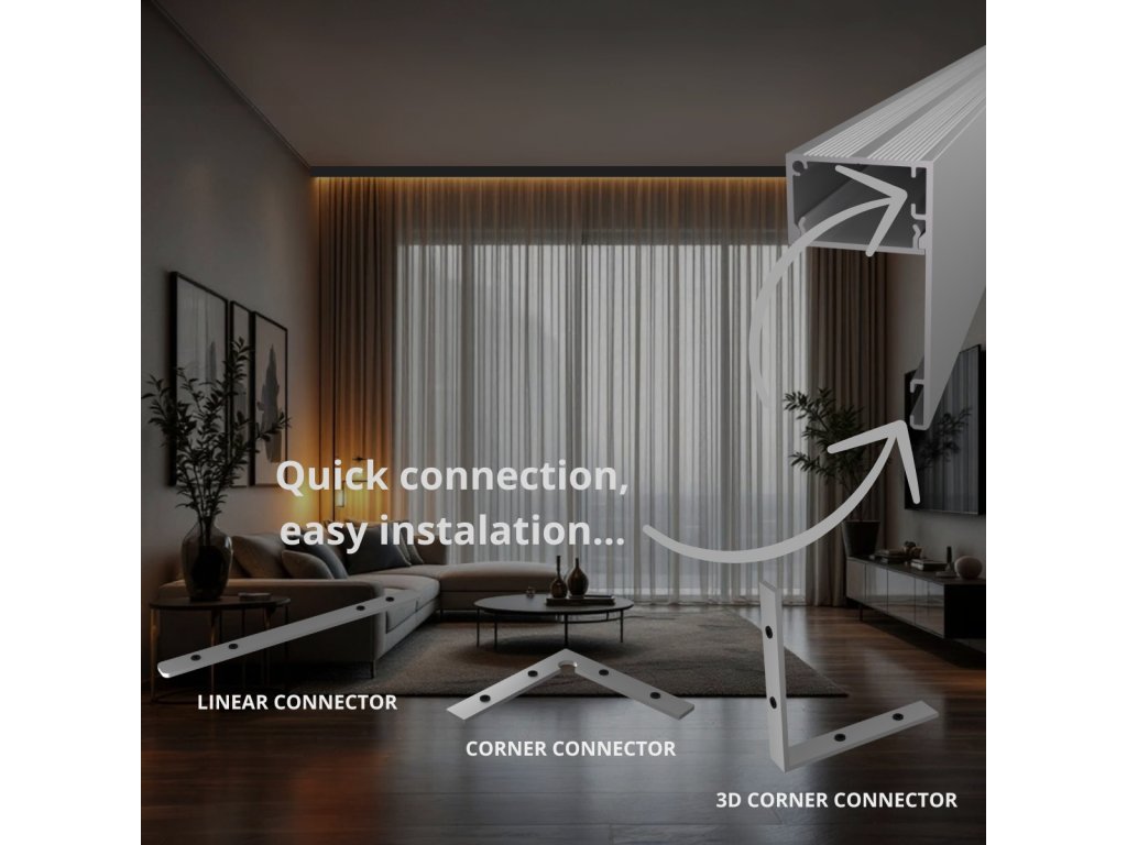 Zároveň je vhodný i pro nepřímé osvětlení stěn, kde pomáhá opticky tvarovat prostor, zvýraznit architektonické linie a místnost vizuálně zvětšit. Při montáži ke stropu profil diskrétně splývá s konstrukcí a vytváří čistý, moderní světelný efekt bez rušivých detailů.