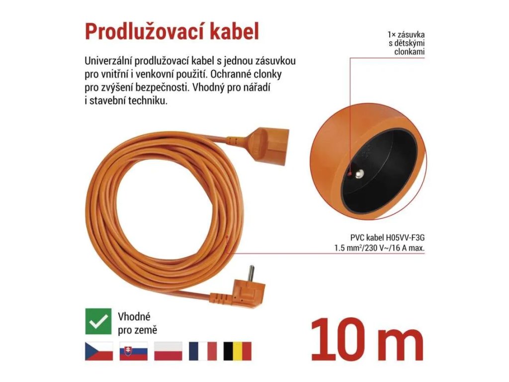 Oranžový prodlužovací kabel - spojka, 10m, 1 zásuvka, PVC, 230V, 1.5mm2