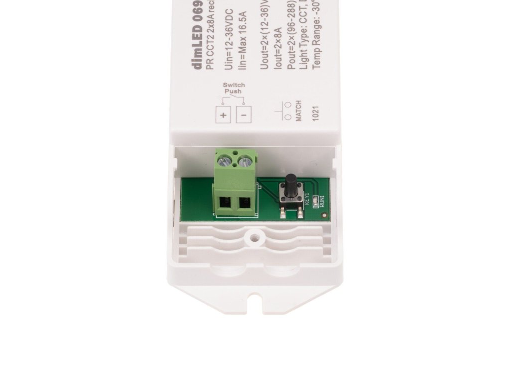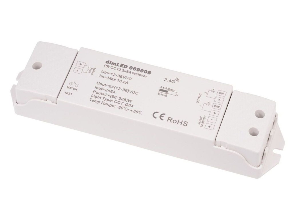 Přijímač je plně kompatibilní se všemi CCT ovladači řady dimLED, které umožňují plynulé přepínání mezi teplou a studenou bílou barvou. K jednomu přijímači lze napárovat až deset různých ovladačů současně, což zajišťuje pohodlné ovládání z různých míst. Pokud potřebujete ovládat více LED pásků samostatně, je nutné použít samostatný přijímač pro každý okruh.